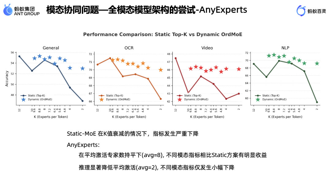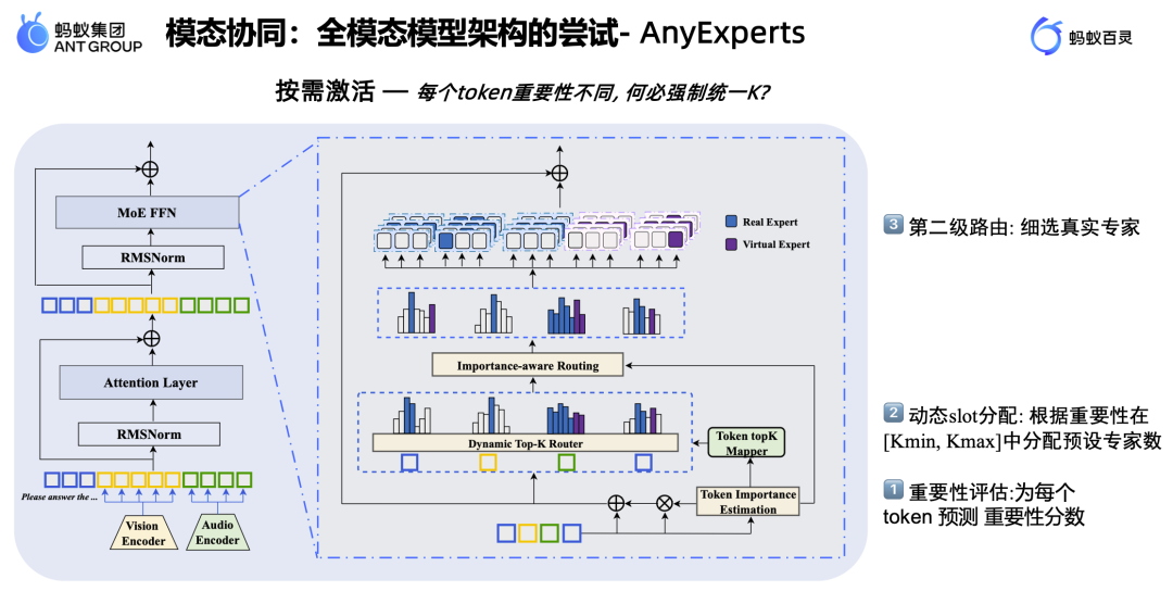动态 Top-K 激活策略:针对不同模态训练特性(如图像 token 少且收敛快、语音 token 多且收敛慢,梯度量级不一致),我们提出根据每个 Token 的重要性动态分配激活的专家数量。该策略显著提升模型在不同任务上的表现平稳性,并在推理时可减少约 1/3 的 Token 计算量,大幅提升效率。