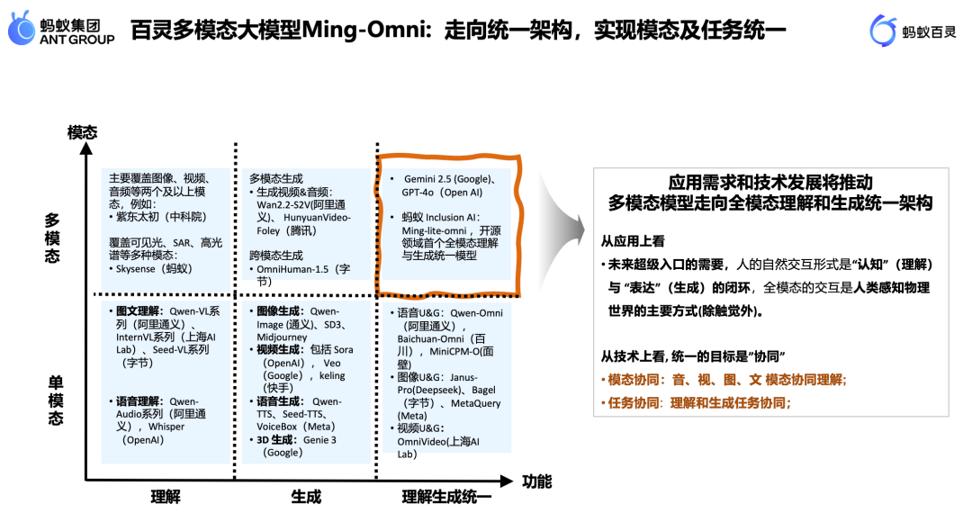 百灵已在开源社区发布了六款多模态模型,我们的多模态技术路径围绕模态和任务两大维度展开: