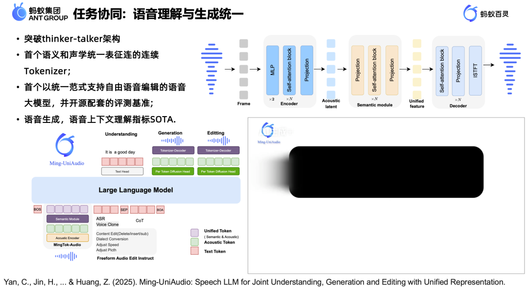 连续统一表征:设计了声学特征(Low-level)与语义特征(High-level)协同优化的 backbone,并彻底抛弃离散 tokenizer,首次实现了连续统一表征——单一连续 token 同时承载语义信息与声学细节,端到端联合优化理解、生成与编辑三大能力。
