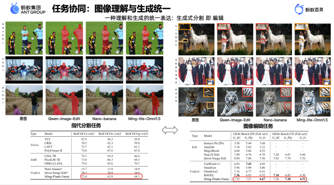 核心认知飞跃——“编辑”即统一:我们发现,图像领域“理解与生成一体两面”的任务,其本质是“编辑”。例如,当用户说“戴哨子的男人”,模型不仅要理解语义,还需精准定位到每个像素——这本质上是通过生成方式进行分割与编辑。