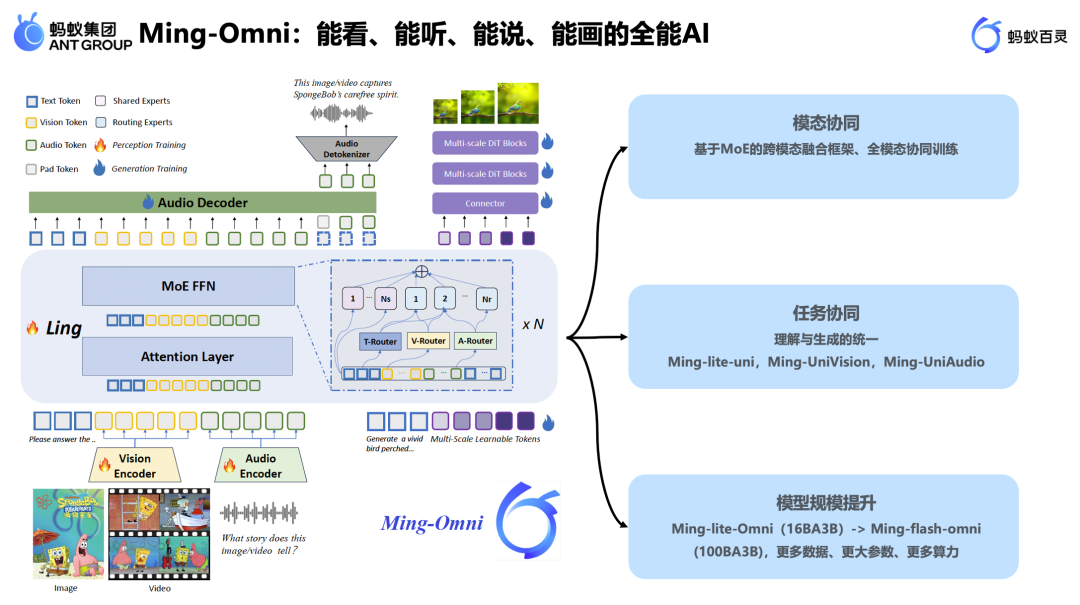 Ming-Omni 模型,是一款“能看、能听、能说、能画”的全能 AI,覆盖绝大多数多模态任务。其核心突破体现在三个方面:模态协同、任务协同与模型规模提升。