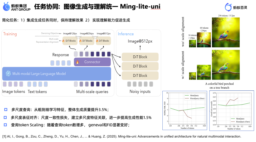我们聚焦于解决理解与生成梯度不连通、优化困难的本质问题。借鉴 Meta Query 经验,我们探索了多尺度 Query 机制来提升图像生成质量。但最关键的突破是提出了非对称 Token 结构,彻底解决梯度不连通问题: