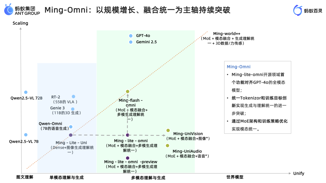 百灵多模态的发展围绕 Scaling(规模化)和 Unify(融合统一)两条主轴,以下这两项成果共同构成了 Ming-Omni 的主体框架,并在此基础上构建了千亿级全模态模型: