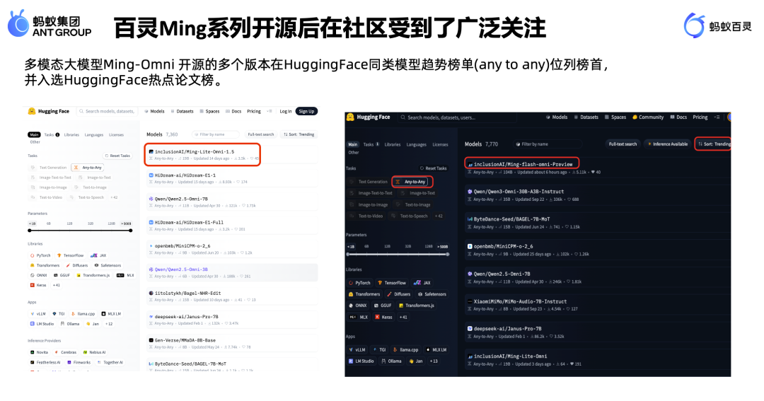 基于这些基石,我们发展出百灵语言大模型(如 Ling-1T 万亿级模型)和百灵多模态大模型(即 Ming 系列)。这些模型正被广泛应用于医疗、民生服务、安全、时空大数据等多个领域,最终为消费者、企业及专业场景提供现代化的 AI 支持。目前,这些模型均已全面开源,并持续通过社区反馈进行迭代优化。