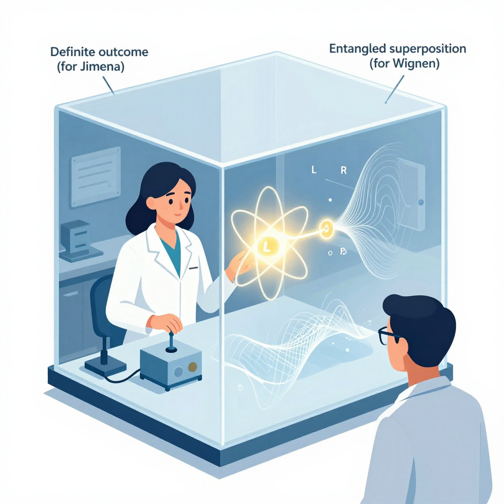 在你眼中,吉梅娜尚未「真正」完成测量;她和原子仍处于「她看到左」与「她看到右」的叠加态中。