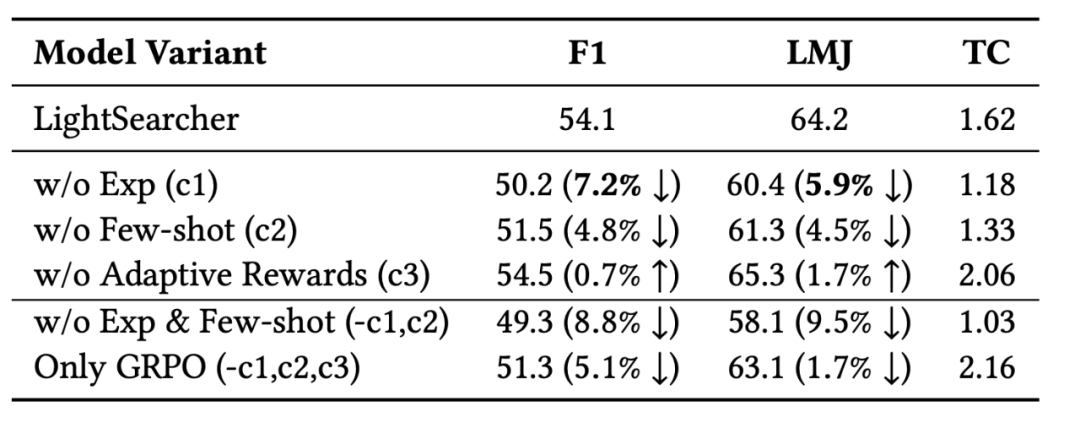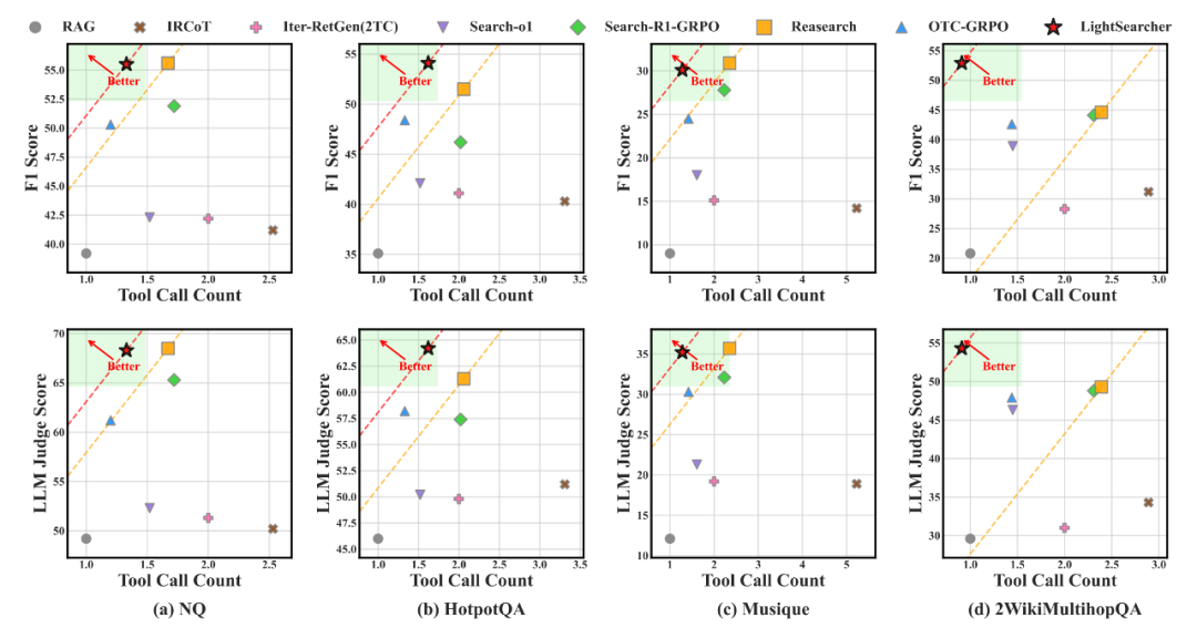 1、模型准确性保持顶尖: LightSearcher在F1分数和LLM评判上与SOTA基线ReSearch相当,甚至在部分数据集上优于ReSearch;