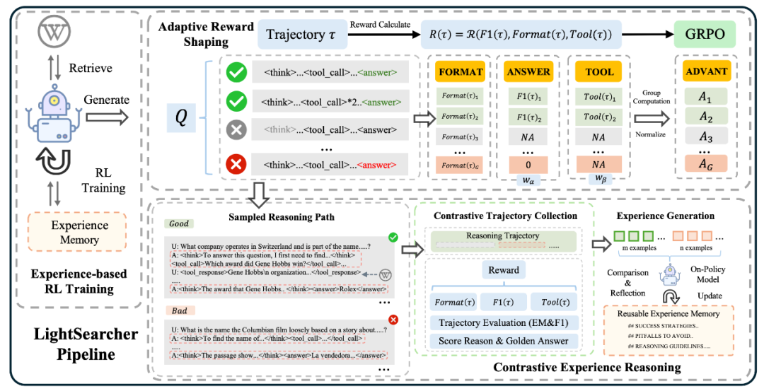 对此,北邮百家AI团队提出LightSearcher框架,首创基于经验记忆的高效RL优化技术,不依赖额外数据,仅通过引入经验记忆机制,实现Agent工具调用高效自主优化,解决痛点问题。