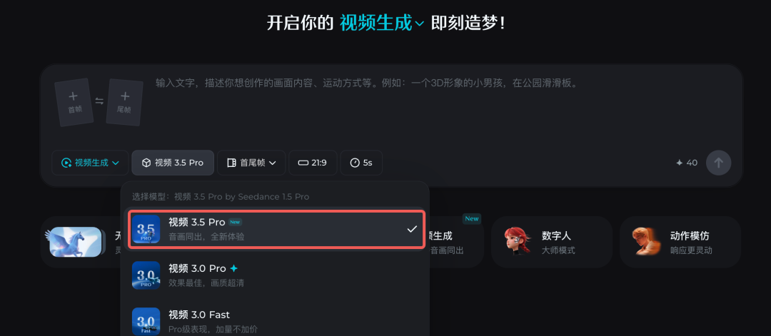 我们以即梦为例,Seedance 1.5 Pro生成视频的操作方式是首尾帧的方式