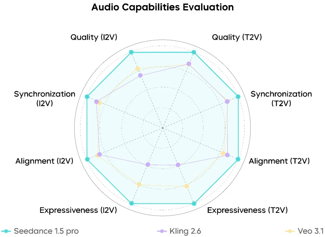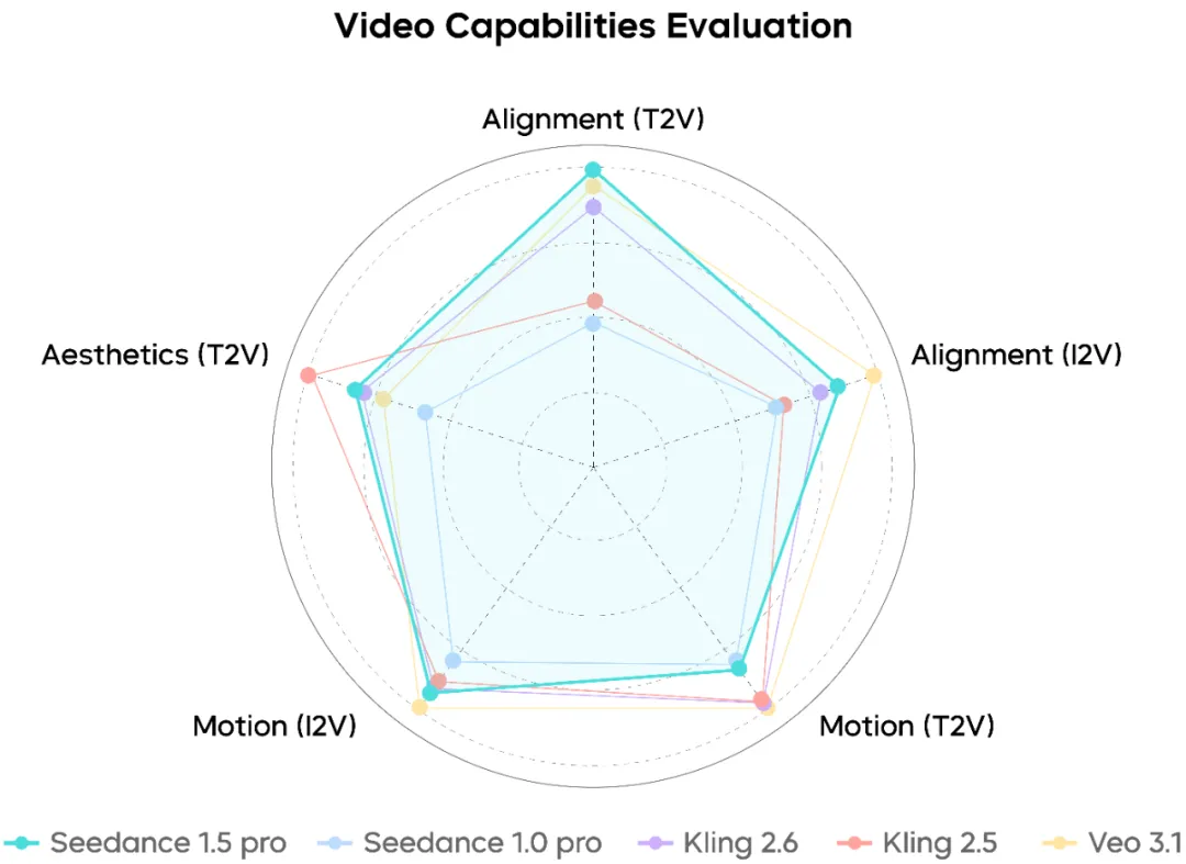 在针对视频与音频能力的综合评测中,Seedance 1.5 pro 在审美(Aesthetics)、运动质量(Motion)以及音画对齐(Alignment) 等核心指标上均处于行业领先地位。