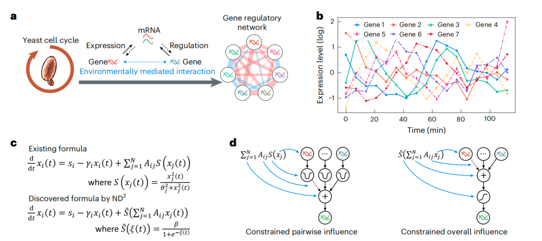 在酵母细胞的分裂周期中,基因之间由环境介导的调控关系可以用一个全连接网络来描述(图 a)。基因表达水平(以表达的 mRNA 数量的对数来衡量)作为网络中各节点的活动量(图 b)。从聚合算子与非线性算子的作用顺序角度,对现有公式与修正后公式进行比较(图 c),并展示二者在算子结构上的差异(图 d)。