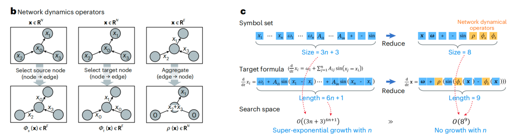 如下图所示,网络动力学算子包含源算子 φ(s)、目标算子 φ(t) 和聚合算子 ρ,这些算子使网络动力学公式的表达不依赖于网络规模,从而将原本随网络规模指数增长的搜索空间压缩成与维度无关的一维问题。