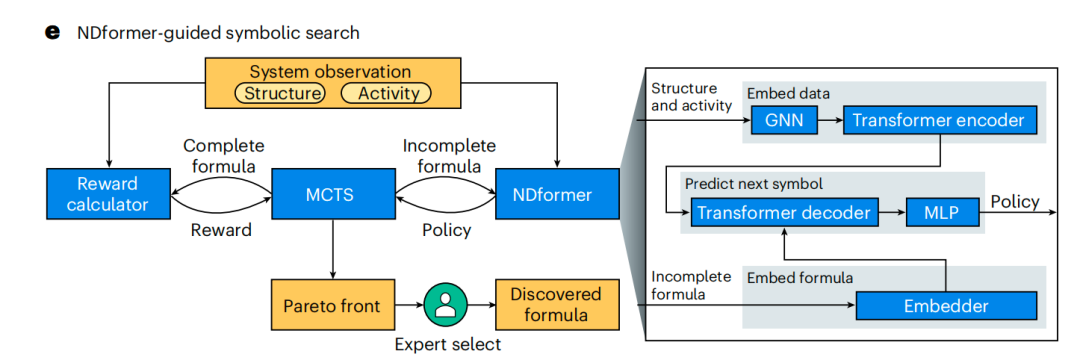 此外,由 NDformer 引导的符号搜索算法通过结合神经网络与符号搜索方法的优势,显著提升了公式发现的效率与准确性。该算法由负责搜索的符号模块和负责引导的神经模块共同组成,如下图所示。神经模块 NDformer 学习捕捉系统潜在动力学的隐含特征,并估计构成公式所需各个符号的概率分布;符号模块 MCTS 则依据 NDformer 预测的概率来选择符号,从而构建候选公式。