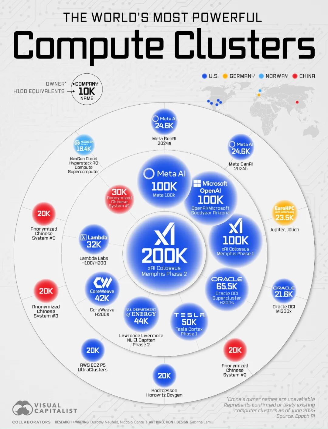 Colossus算力猛兽:xAI正在孟菲斯加速扩建其超级计算机集群。目前已拥有约20万枚GPU,最终目标是打造拥有100万枚GPU的世界最强AI训练平台。