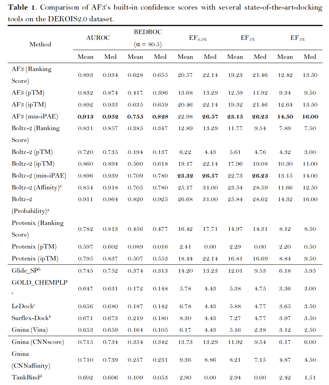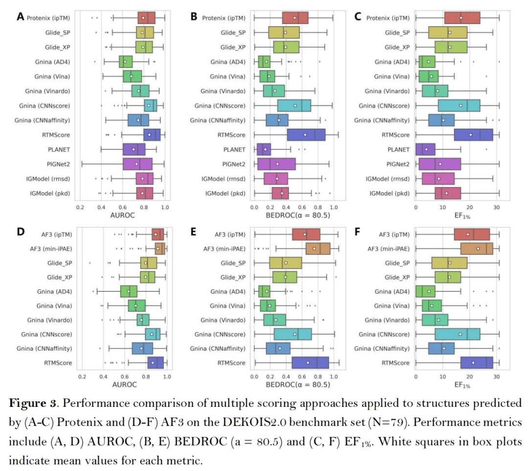 在经典的DEKOIS2.0基准数据集(79个靶点,含实验验证活性化合物与性质匹配诱饵分子,去除了两个P-P界面结合特性靶点)中,AF3类方法展现出卓越性能: