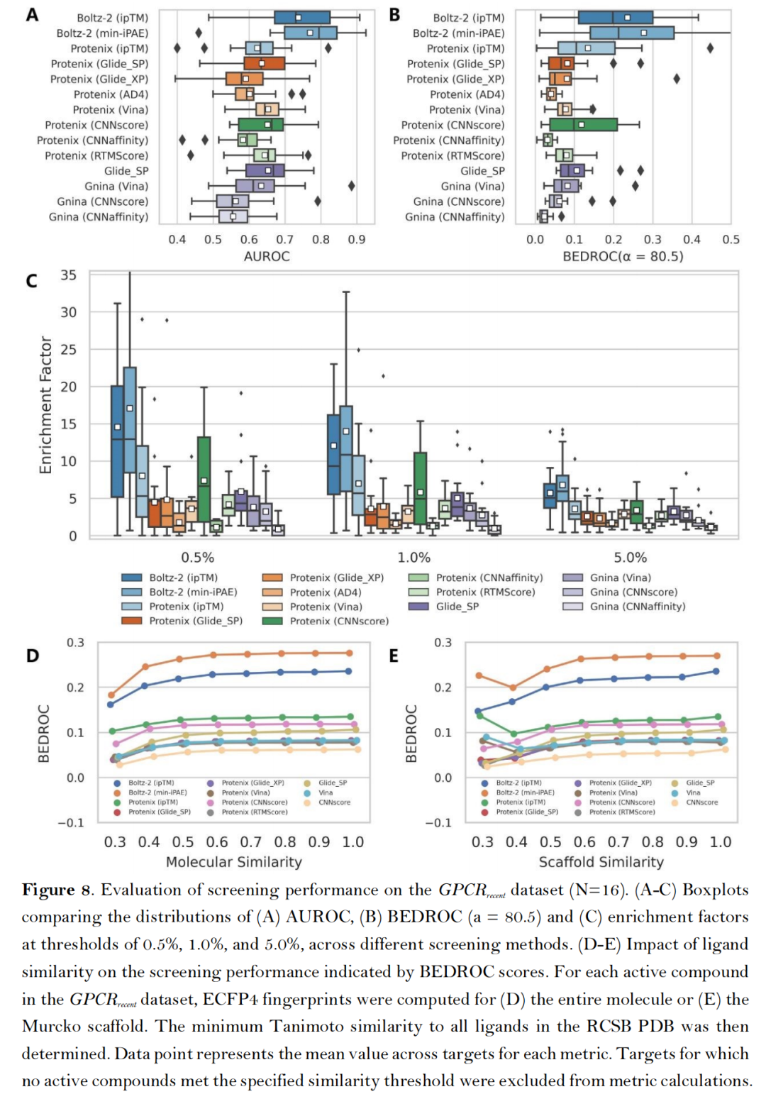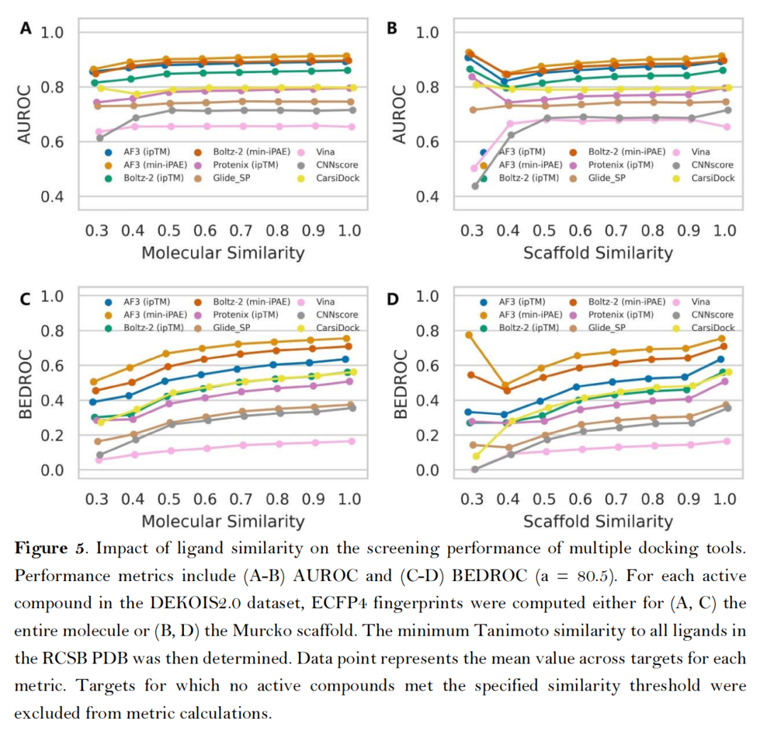 配体相似性依赖测试:当逐步剔除与训练集结构相似的活性配体,AF3类方法的AUROC指标呈渐进式下降,但仍显著优于传统工具,且min-iPAE指标对配体结构新颖性的耐受性最强;