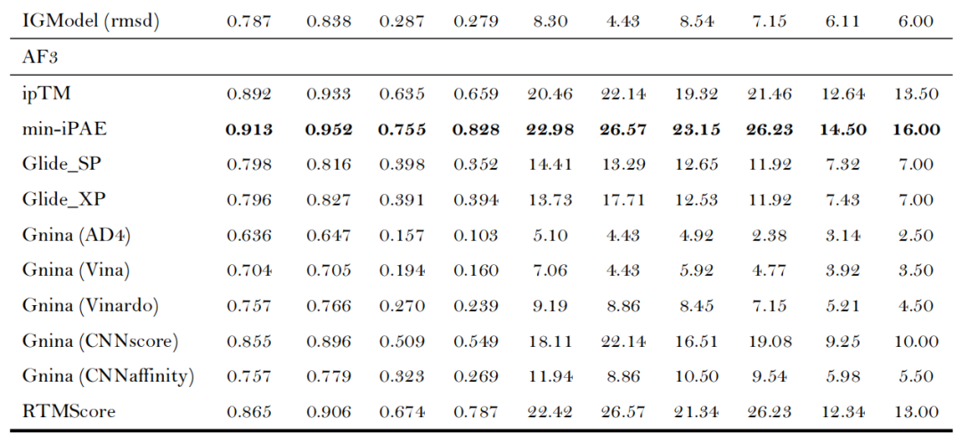 核心指标领先:AF3的min-iPAE指标表现最优,平均AUROC达0.913、BEDROC(α=80.5)达0.755、EF₁%达23.15,显著优于传统对接工具(如Glide SP的AUROC 0.745、EF₁% 12.01)及主流AI对接工具(如CarsiDock的AUROC 0.797、EF₁% 18.65)[注:由于Boltz-2团队未发布其具体的训练集,其Affinity模块得到的结果仅供参考];