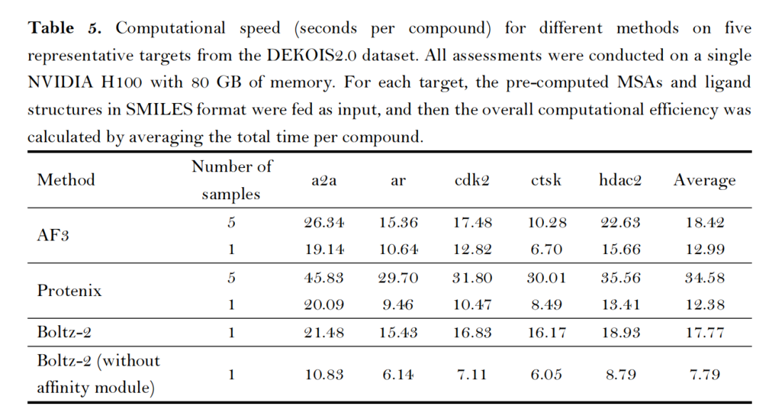 计算效率平衡:在NVIDIA H100 GPU上,AF3生成5个构象需18.42秒/化合物,Protenix需34.58秒/化合物,Boltz-2(关闭亲和力模块)最快仅需7.79秒/化合物;内存占用方面,Protenix与Boltz-2仅需5GB,远低于AF3的60GB,更适合大规模筛选场景;