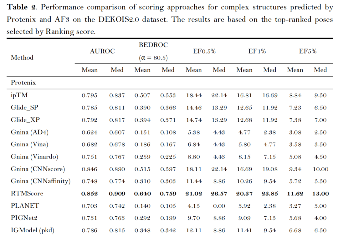 置信度指标有效性:ipTM(界面结构精度)与min-iPAE(链间相互作用可靠性)是最优筛选依据,其性能超越复合指标Ranking score及全局结构指标pTM,证实复合物界面结构评估对筛选结果的关键作用; 第三方打分函数无增益:Glide、Gnina、RTMScore等外部打分函数未能提升AF3/Protenix的筛选效果,仅CNNscore与RTMScore可接近内置指标性能,印证了AF3类方法结构预测与质量评估的自洽性。