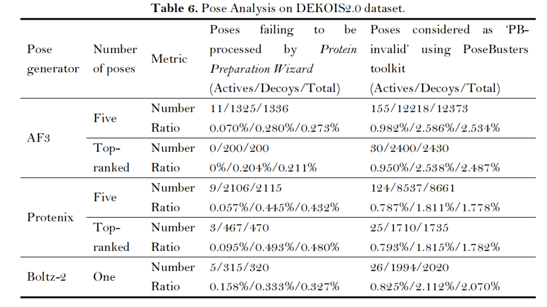 构象物理合理性:AF3/Protenix/Boltz-2预测的复合物构象中,仅0.27%-0.43%存在严重结构异常(无法通过Protein Preparation Wizard处理),经PoseBusters工具验证,97%以上构象符合物理规则。