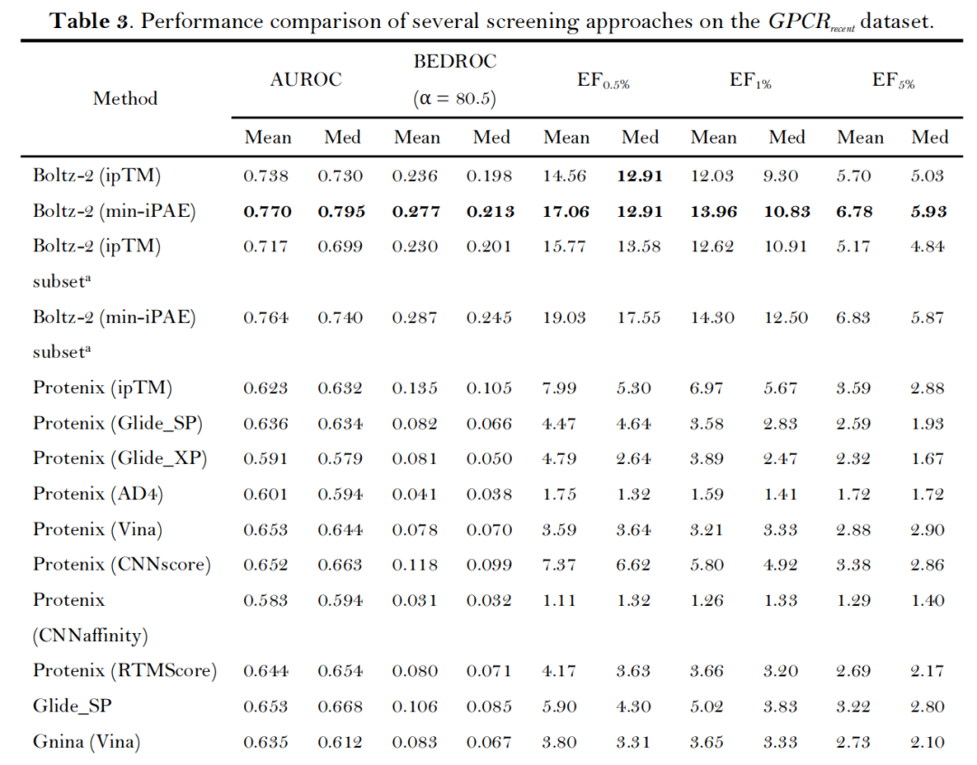 由于AlphaFold3显存占用过大,时间较长,后面两个实验没有比较AlphaFold的结果 新靶点适应性测试:在2022年后新解析的GPCRrecent数据集(16个靶点)中,Boltz-2的min-iPAE指标仍保持优异表现(AUROC 0.770、EF₁% 13.96),即使在2023年6月后新增的6个靶点子集上,性能依旧稳定(AUROC 0.764、EF₁% 14.30)。【虽然这个有时间限制的数据集可能为主要依赖晶体结构的方法提供了一个补充测试,但Boltz2可能已将几乎所有可用结合数据纳入模型训练,可能结果仍不能反应真实泛化能力】;