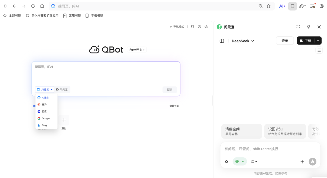 在AI入口的设计上,腾讯元宝常驻在搜索框中,也可以从侧边栏一键唤起;但如果大家更习惯传统搜索,也可以在AI搜索、搜狗、百度、谷歌、Bing多种引擎之间随手切换: