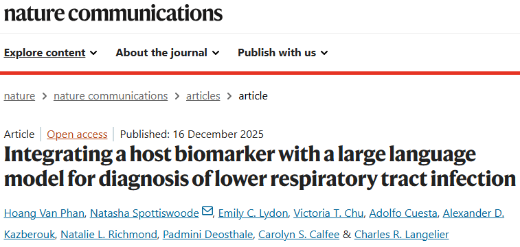 Phan, H.V., Spottiswoode, N., Lydon, E.C. et al. Integrating a host biomarker with a large language model for diagnosis of lower respiratory tract infection. Nat Commun 16, 10882 (2025).