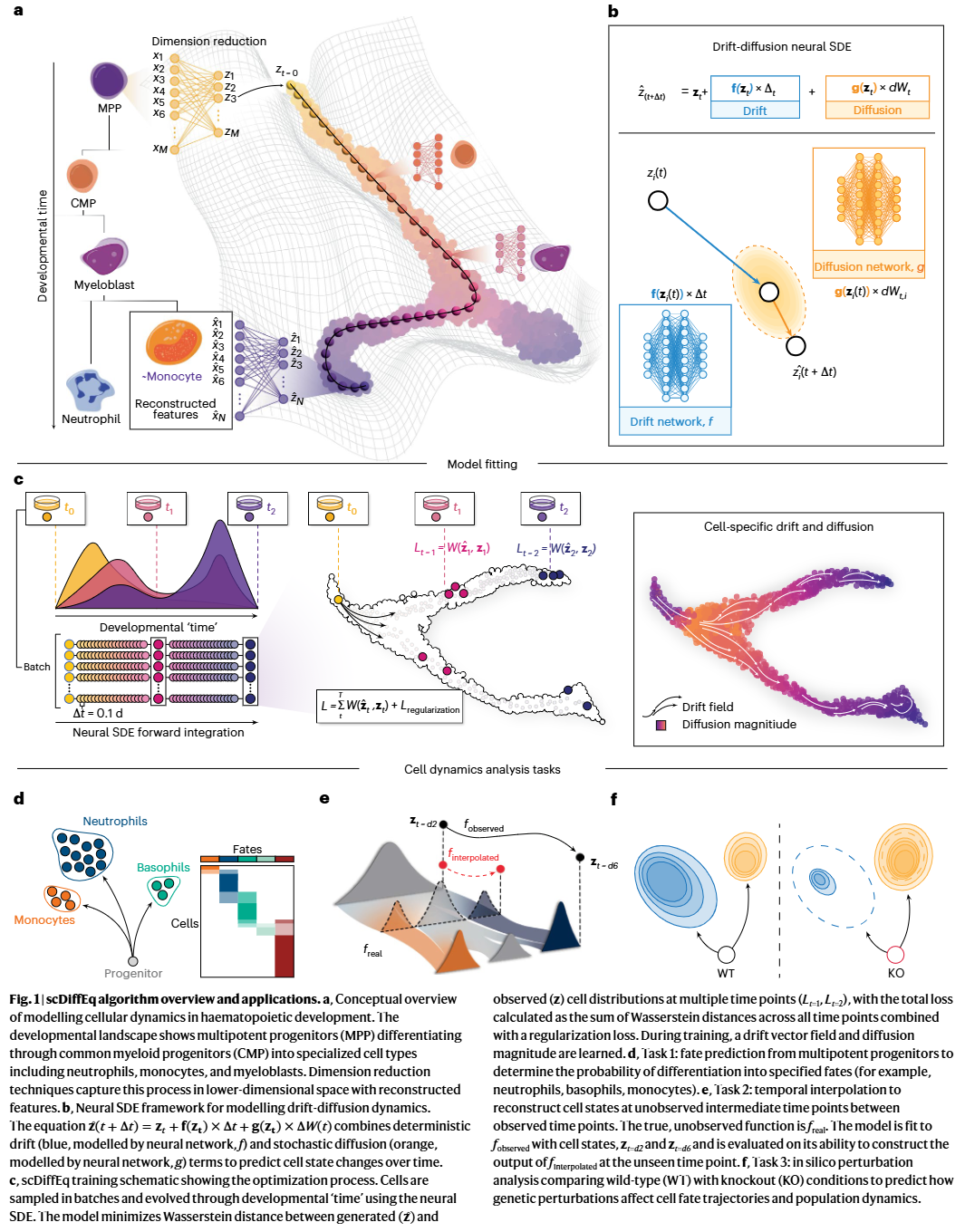 单细胞测序为重建生物系统的动态过程提供了关键线索,但细胞命运决定同时受到确定性调控与随机波动的共同影响。现有方法多聚焦于确定性动力学,对随机性建模不足。研究人员提出 scDiffEq,一种基于神经随机微分方程(neural SDE)的生成式框架,用于同时学习细胞状态演化中的漂移(确定性)与扩散(随机性)。在带有谱系追踪的造血单细胞数据上,scDiffEq 在细胞命运预测、时间插值及体内外扰动模拟方面均优于现有方法,并可推广至仅含单时间点的单细胞数据,为解析发育与疾病中的细胞动力学提供了统一工具。