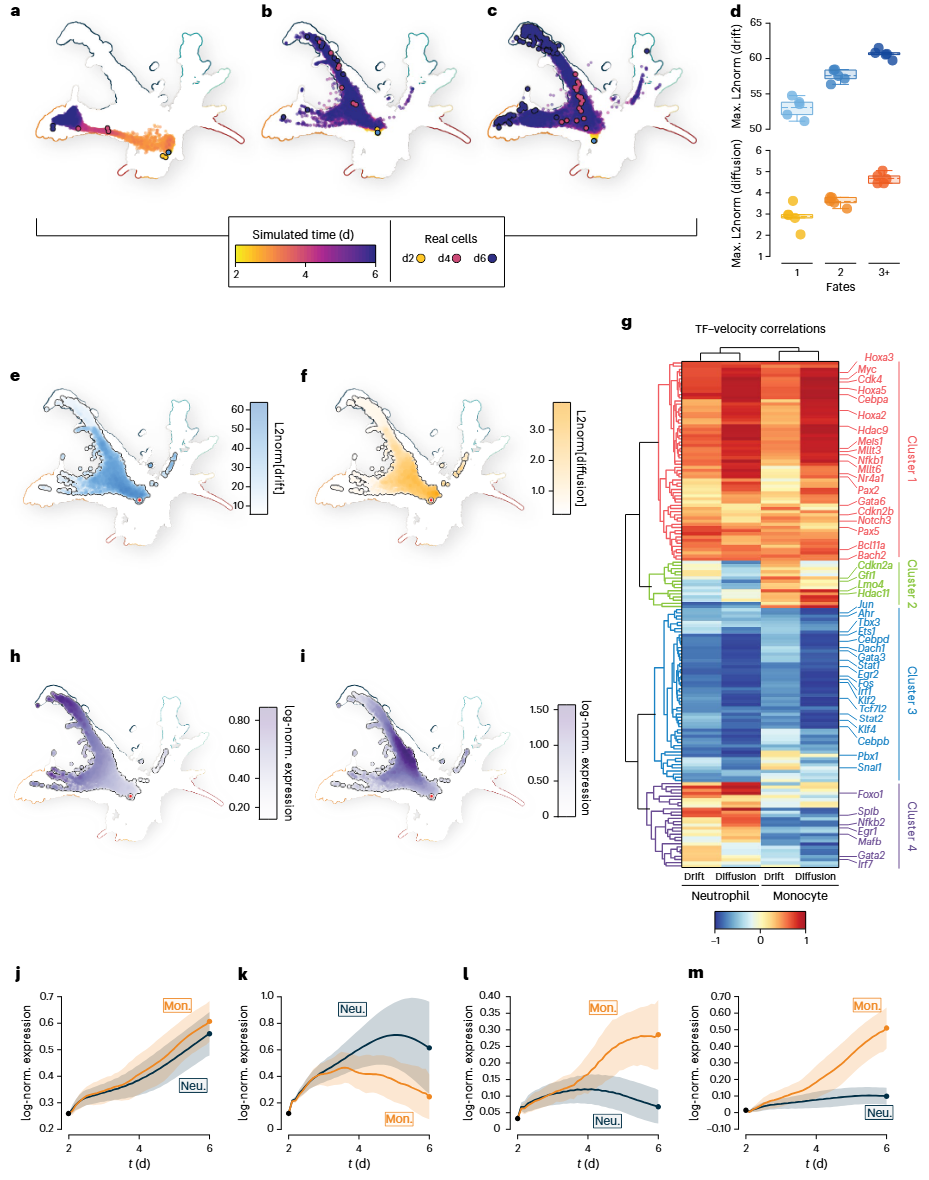 分析显示,细胞可塑性越高,其漂移与扩散幅度越大。scDiffEq 揭示了不同发育分支中确定性与随机性成分的动态变化,并能关联到关键调控因子的时序表达模式。