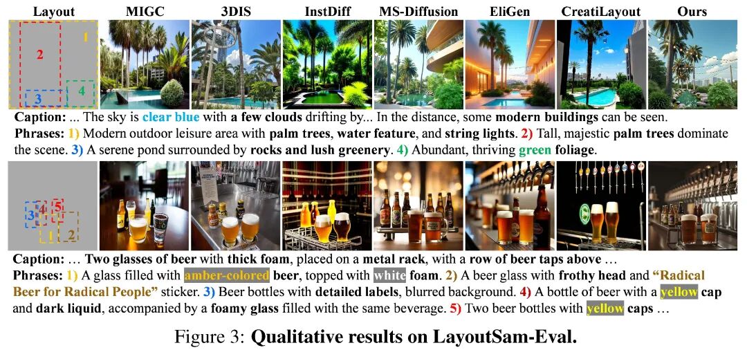在COCO-MIG基准上,模型在空间准确性 (mIoU) 提升5.9%,显著优于基线模型。