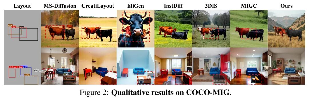 而能以参考图像为指导的方法,则难以实现对布局的精确控制,且在实例数量增加时面临着严重的身份信息丢失问题。