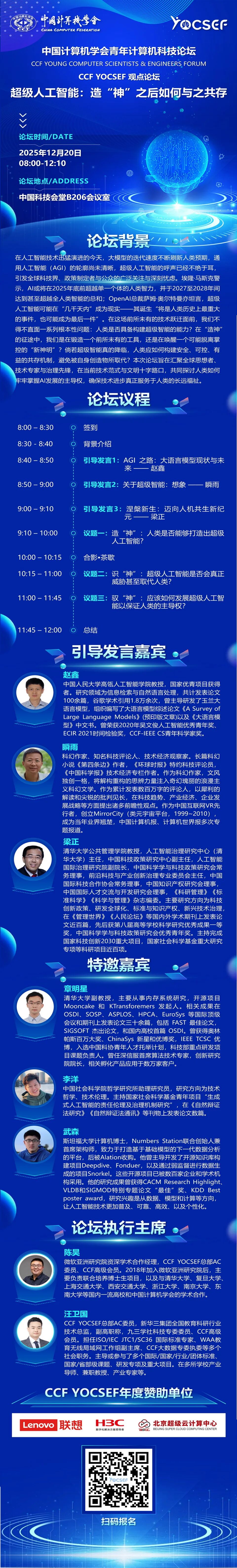 在人工智能迈向通用智能、技术能力持续跃迁的背景下,如何在推动创新突破的同时实现风险可控、价值对齐与社会共生,正成为全球科技界与公共治理领域共同面对的核心议题。以“超级人工智能:造‘神’之后如何与之共存”为主题,本次中国计算机学会青年计算机科技论坛(CCF YOCSEF)年度论坛,汇聚学术界、产业界与政策研究领域的多方力量,围绕超级人工智能的发展路径、治理边界与人类社会的应对策略展开深入讨论。