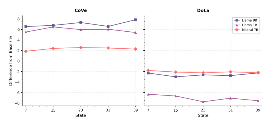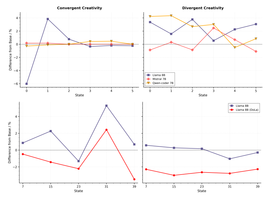 与上述两种技术相反,DoLa 会系统性降低模型的发散性创造力。在两个基准上,基于 DoLa 的大多数模型的表现均略低于基线,这表明,创造力下降来自 DoLa 本身,而非模型结构差异。
