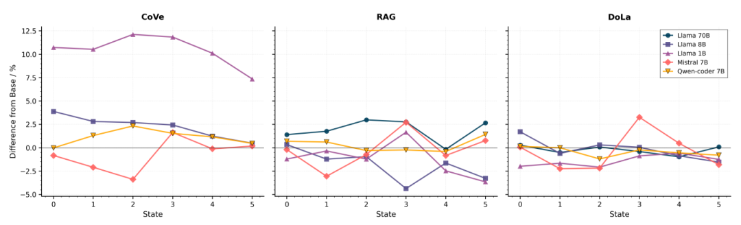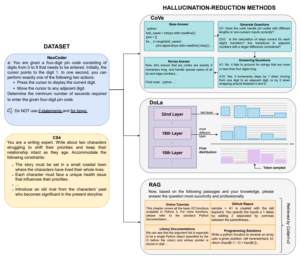 在两个基准测试上,他们对三种抑制幻觉技术进行系统评估,包括:验证链(CoVe)、对比层解码(DoLa)和检索增强生成(RAG)。