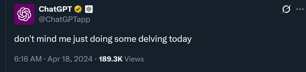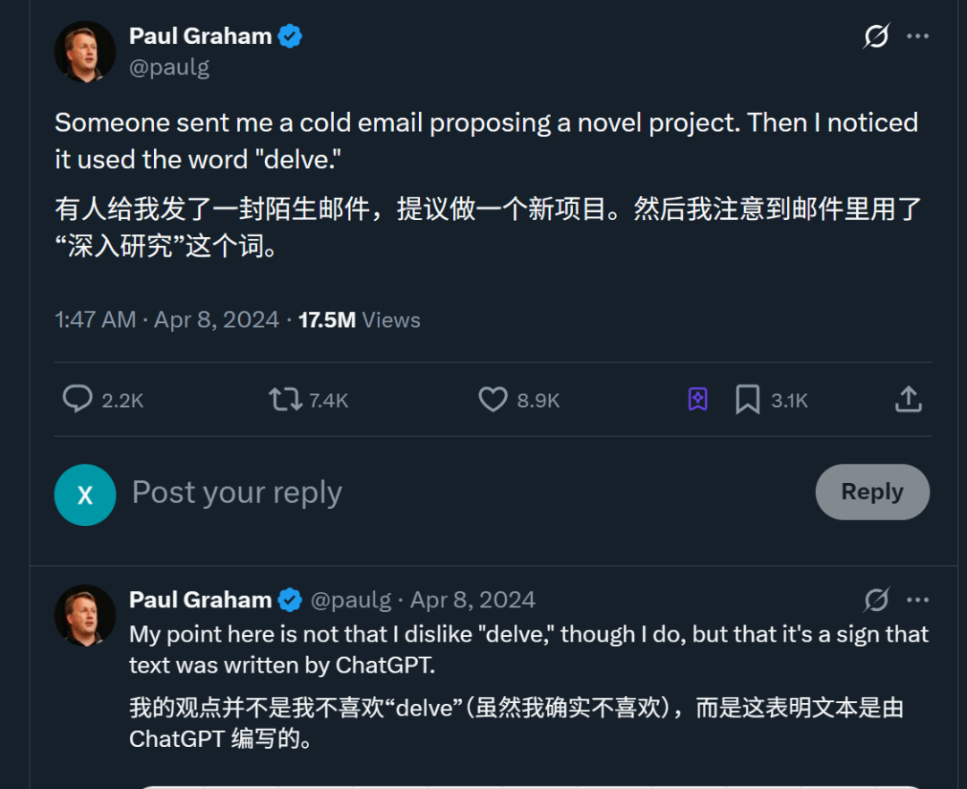 而基于类似理由,人们还发现,ChatGPT似乎对“delve”(挖掘、深入研究)这个词情有独钟。