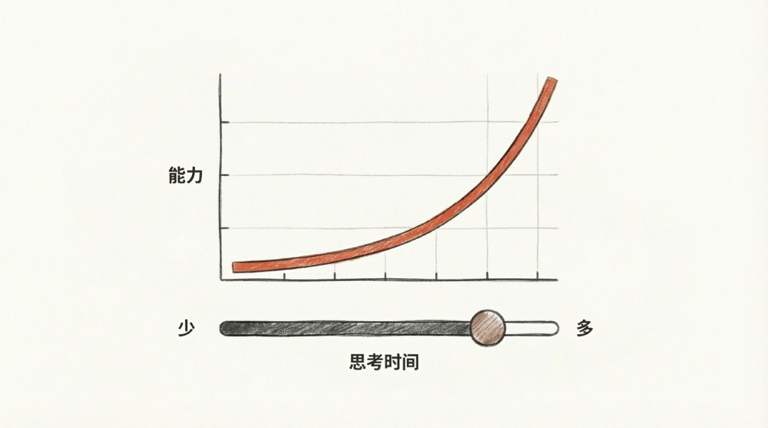 RLVR 还带来了一个全新的调节旋钮和配套的 Scaling Law:通过生成更长的推理链条、增加「思考时间」,我们可以在推理阶段用更多算力换取更强的能力。