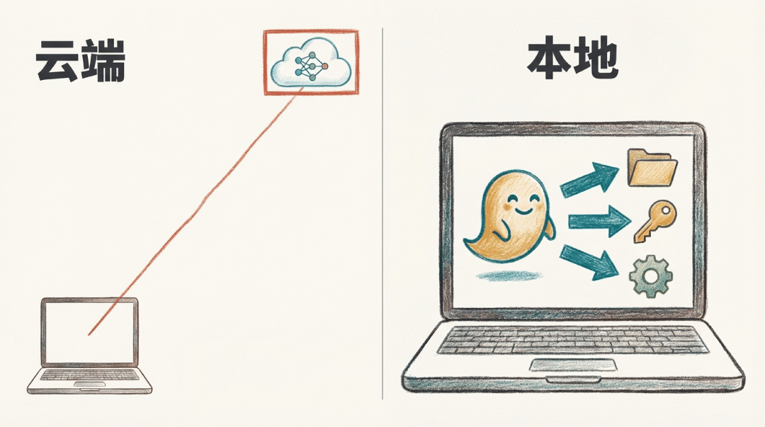 注意,真正关键的区别不在于 AI 操作碰巧在哪里运行(云端、本地还是别处),而在于其他一切:那台已经开机、配置好的电脑,它的安装环境、上下文、数据、密钥、配置,以及低延迟的交互。
