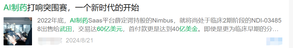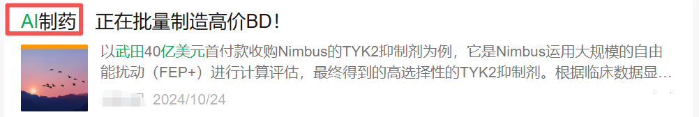 此前,智药局公众号分享了武田60亿美元收购TYK2抑制剂的背后故事。外界其他公众号纷纷表述“其为AI制药的典型成功案例”