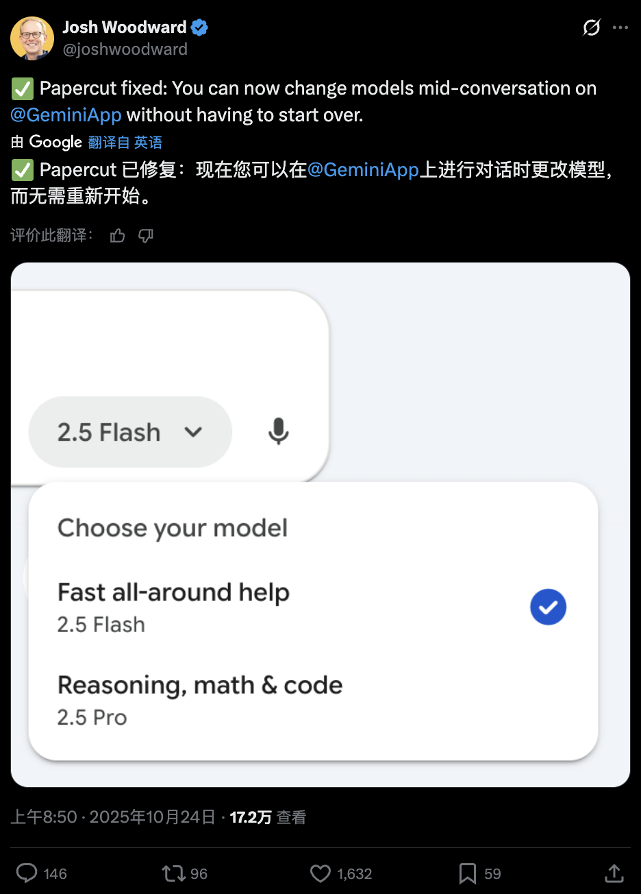 不久他就在自己的 X 账号上骄傲地宣布:「Papercut 已修复:现在你可以在 Gemini 应用的对话中途切换模型而无需重新启动会话了。」