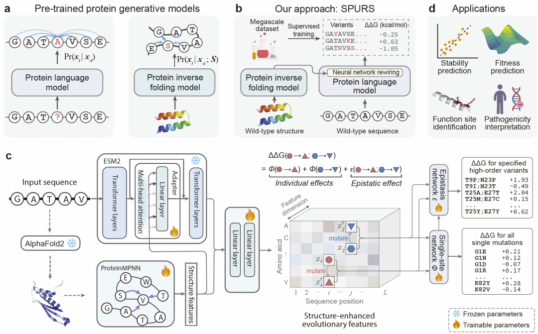 蛋白稳定性变化预测对疾病机制解析与蛋白工程至关重要,但受限于数据偏倚与模型泛化能力,长期难以规模化应用。研究人员提出 SPURS,一种通过模型重构(rewiring)整合蛋白语言模型与逆折叠模型的深度学习框架,并在超大规模稳定性数据上进行高效微调。SPURS 在多个独立数据集上实现了更高准确性、更强泛化性与更优计算效率,不仅可预测单点与多点突变的稳定性变化,还可拓展至功能位点识别、低样本蛋白适应度预测以及人类疾病变异机制解析。