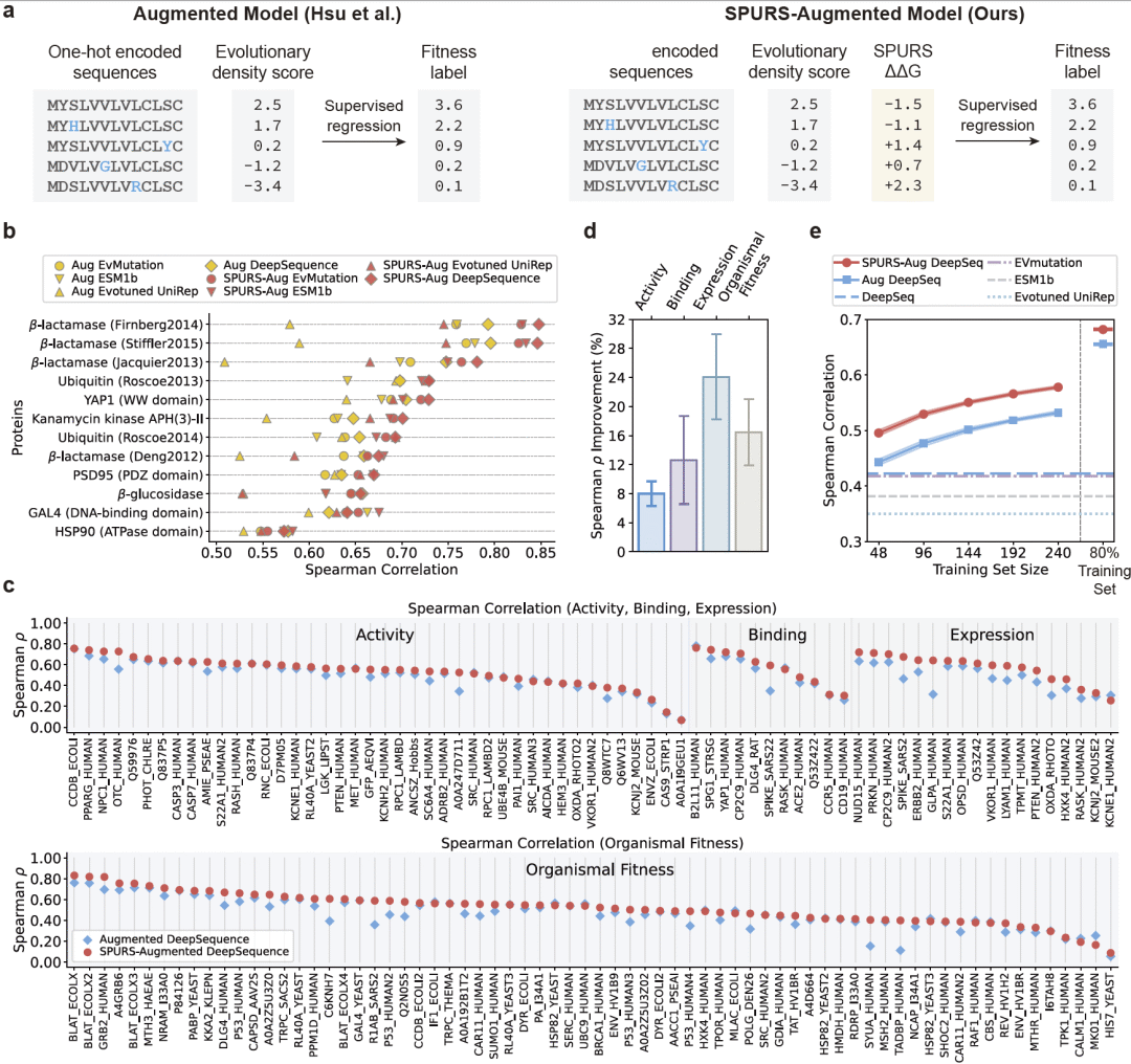 图 4|SPURS 增强模型提升低样本(low-N)蛋白适应度预测性能。