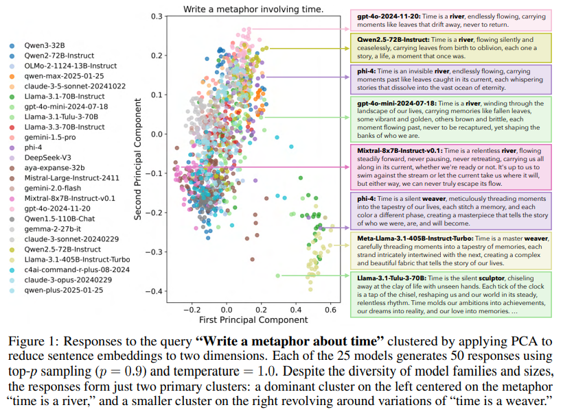 基于 Infinity-Chat,我们开展了一项大规模的语言模型模式坍塌(mode collapse)研究,揭示了在开放式生成场景中显著存在的 “人工蜂群思维(Artificial Hivemind)”效应。该效应主要体现在两个方面:(1)模型内重复性,即同一模型在不同生成中反复产出高度相似的回答;以及更为显著的(2)模型间同质性,即不同模型之间生成的内容高度相似、令人惊讶地趋同。