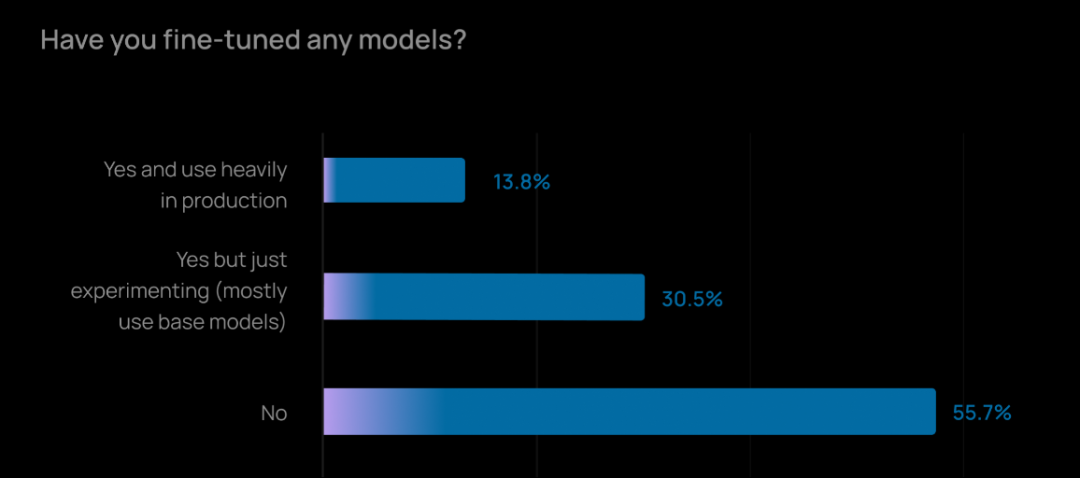 与此同时,微调(Fine-tuning)仍然没有成为主流选择。 57% 的组织没有进行微调,而是更依赖于提示工程和 RAG(检索增强生成)技术。主要是因为微调需要在数据收集、标注、训练基础设施和持续维护上进行大量投入,目前仍是少数高价值或专业化场景的选择。