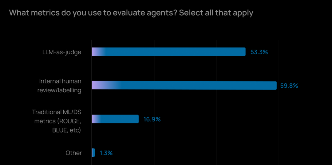 大家普遍依赖人机结合的方法:一方面,采用将大语言模型用作评判者(LLM-as-judge)(53.3%)的方式来扩大评估的覆盖面,同时通过人工审查来保证评估深度;另一方面,通过人工审查(59.8%)来保证评估的深度,尤其是在处理精细或高风险场景时。