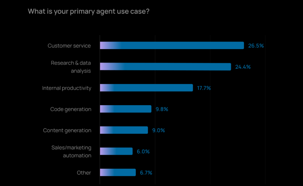 客户服务(26.5%)成为最普遍的 Agent 用例,研究与数据分析(24.4%)紧随其后。两者合计占据了所有应用场景的一半以上。