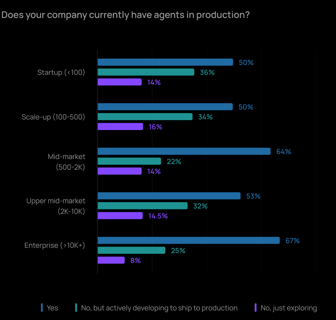 Agent 实际落地应用趋势明显。57% 的受访者已将 Agent 投入到生产环境中,且规模越大的企业,落地速度越快;