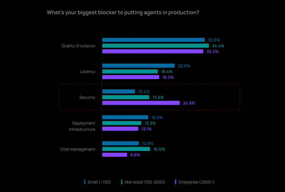 和去年一样,质量仍然是阻碍 Agent 大规模应用的最大障碍,三分之一的受访者将质量视为主要瓶颈。这里的质量问题,指的是 Agent 的准确性、相关性、输出结果的一致性,以及在维持适切语调、遵循品牌或政策规范方面的能力。