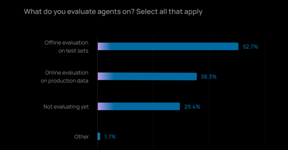 关于 Agent Evals 的实践还不够成熟。约半数团队会进行离线评估,只有约三分之一的团队会在真实的生产数据上进行在线评估。