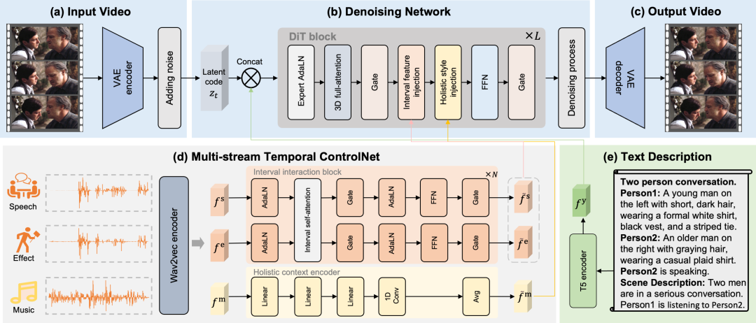 音频驱动视频生成的现有方法,往往面临音频整体性带来的处理限制,使音频与视觉之间的对应关系趋于模糊。对此,北京智源人工智能研究院、北京大学、北京邮电大学共同提出了一种基于解混音频的音画同步视频生成框架,将输入音频拆分为语音、音效和音乐三类音轨,验证了音频解混与多流控制在复杂视频生成任务中的有效性。