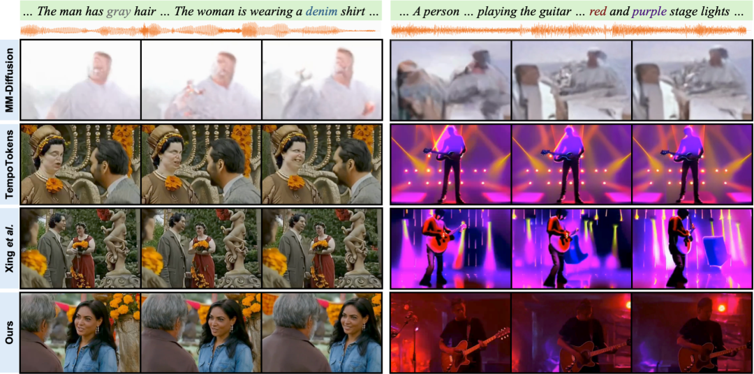 例如,即便利用官方代码在 8 块 NVIDIA A100 GPU 上对 MM-Diffusion 进行超过 32 万步微调,其仍难以生成具有一致叙事结构和视觉连贯性的画面,整体风格偏向于局部片段拼接。而 TempoTokens 在面对复杂场景时,则容易出现人物表情和动作不自然的问题,尤其在多人或高动态场景中,生成结果的真实性受到明显影响。在音画同步方面,Xing 等人的方法难以实现特定事件时序的音频同步,致使吉他演奏中人物手势渲染错误(如上图右侧所示)。