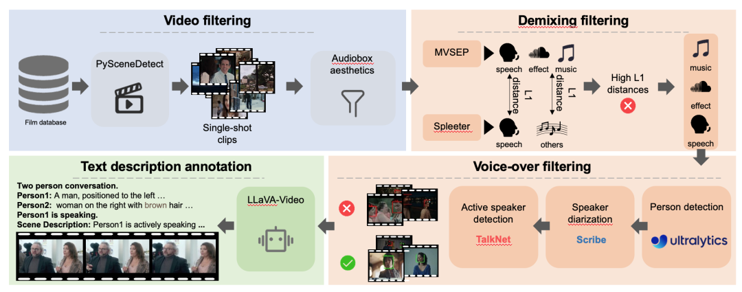 本文首先通过详细的过滤流程得到 DEMIX 数据集,过滤后的 DEMIX 数据被结构化为五个重叠的子集:基本面部、单人、多人、事件音效和环境氛围。基于五个重叠的子集,本文引入了多阶段训练策略,逐步扩大模型的规模。首先,使用基本面部子集训练模型学习嘴唇运动;模型接着在单人子集上学习人体姿势、场景外观和相机移动;随后,在多人子集上训练模型,以处理有多个说话者的复杂场景;然后,本文训练重点转移到事件时序,并使用事件音效子集将主体理解从人类扩展到对象;最后,本文在环境氛围子集上训练模型,以提高其对视觉情绪的表示。
